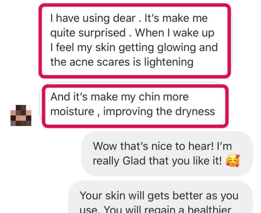 Find out more"It makes me quite surprised! When I wake up I can feel that my skin is glowing and acne scars were lighten. My chin is more moisturized now!"