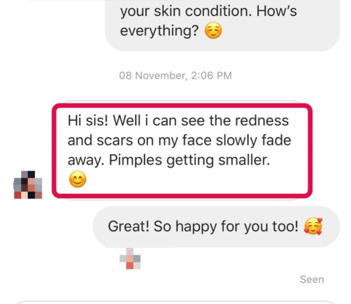"I can see the redness and scars on my face slowly fade away. Pimples getting smaller."